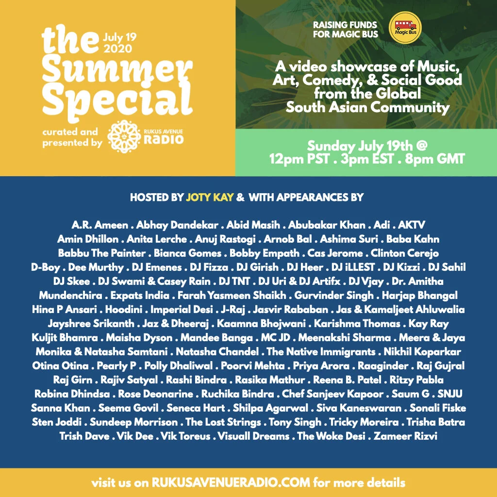 The video showcase of music, art, comedy, and social good from the global South Asian community can be viewed by visiting RukusAvenueRadio.Com and sending in an RSVP there.
